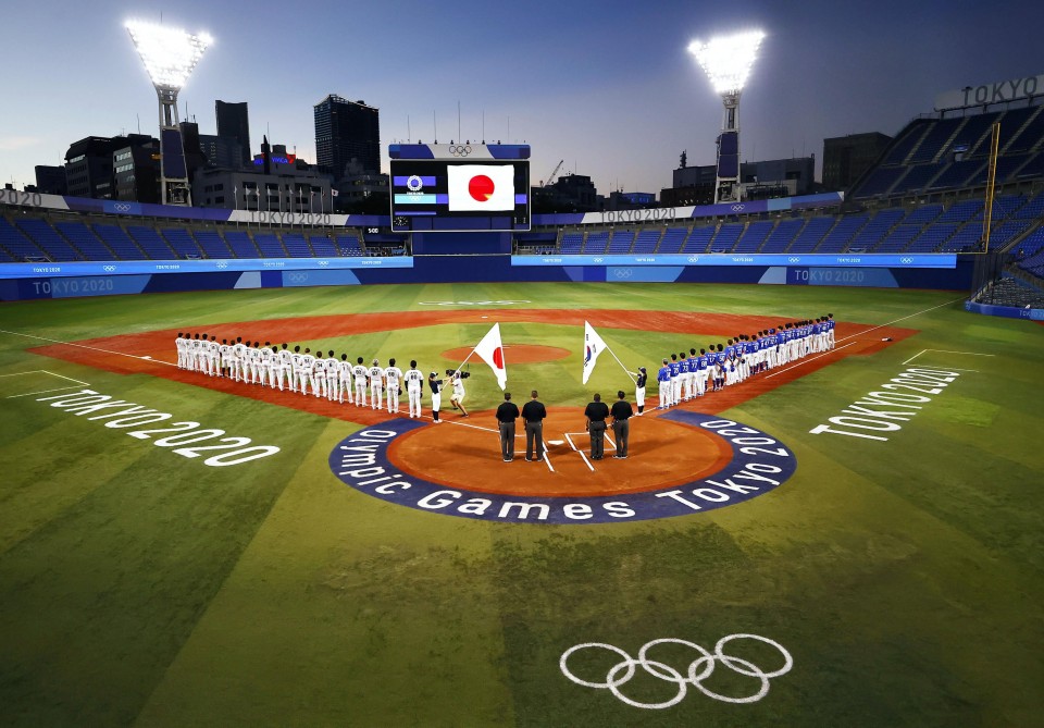 Japan (L) and South Korea players line up ahead of the Tokyo Olympic baseball semifinal on Aug. 4, 2021, at Yokohama baseball stadium near Tokyo. (Kyodo) ==Kyodo